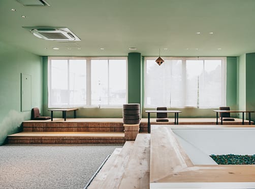 4Fフロアは、天窓や大きく開かれた窓から、自然の光や風を感じ、お寺の鐘の音を聞きながら過ごすことができる空間(TEN)です。靴をぬいでリラックスしながら、アイデアの創造や企画の構想などにお使いいただくことができます。