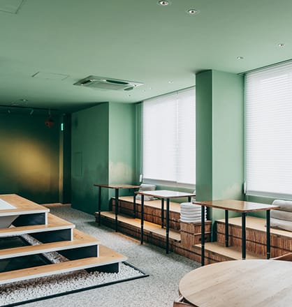 1Fフロアは、植物を囲むように設置された大きなテーブルや、ゆったりと座っていただける椅子、お打合せや談笑にもピッタリのソファ席があります。のんびりと過ごしたり、ゲストを招いてお打合せをしたりと、コミュニケーションを取りながら過ごしていただけます。Libraryもあり、会員の方へ貸し出しも可能です。たくさんの書籍の中から何かヒントが見つかるかもしれません。